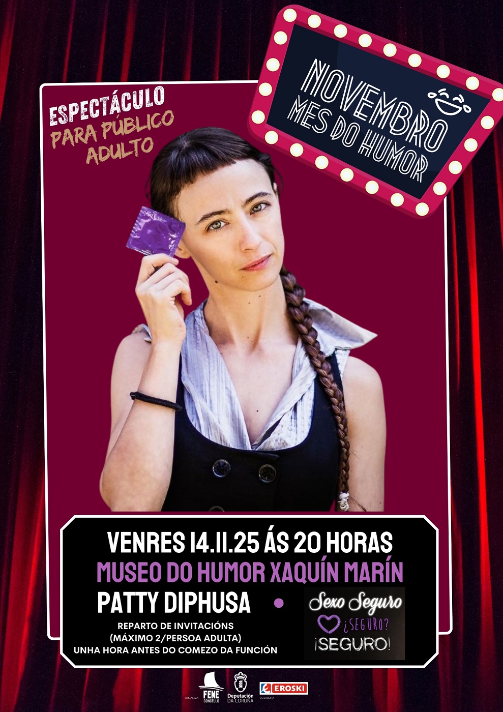 A segunda función do ciclo de monólogos que organiza o Museo do Humor Xaquín Marín para conmemorar o seu aniversario trae este venres a Fene á monologuista, malabarista e paiasa Malala Ricoy no seu papel de Patty Diphusa. A cita co espectáculo titulado Sexo seguro. Seguro? Seguro! será o venres 14 de novembro ás 20.00 horas. Entrada de balde con invitación que se poderá recoller (até un máximo de dúas por persoa adulta) na conserxería da Casa da Cultura de Fene ese mesmo día a partir das 19 horas. Aforo limitado.