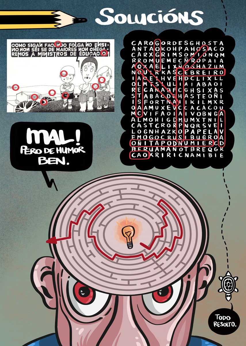 Solucións ás actividades propostas na primeira unidade didáctica do Museo do Humor Xaquín Marín-Concellería de Cultura de Fene (Concello de Fene), elaborada coa colaboración da Xunta de Galicia, a través do programa de axudas destinadas a centros museísticos da comunidade autónoma de Galicia 2025.A publicación consta de 16 páxinas a toda cor e aborda en ton desenfadado e divertido diversos temas como a definición de humor gráfico; os tipos de humor que existen ou as temáticas que se adoitan empregar no humor gráfico.En Mal, pero de humor ben, “Xaquín Marín é un debuxante xubilado que fala de cousas da profesión que lle deu de comer ao tempo que fai comentarios en ton de humor sobre a situación da terceira idade e a condición de estar xubilado. E, acompañando as súas reflexións, aparecen viñetas de Isolino e Gaspariño, a modo de exemplo; pasatempos relacionados co mundo do humor gráfico e a creación de viñetas; exercizos prácticos de escritura e debuxo para poñer a proba a destreza dos lectores na arte de facer humor; humor gráfico, caricatura e banda deseñada; e explicacións sobre como como facer unha viñeta de humor”.