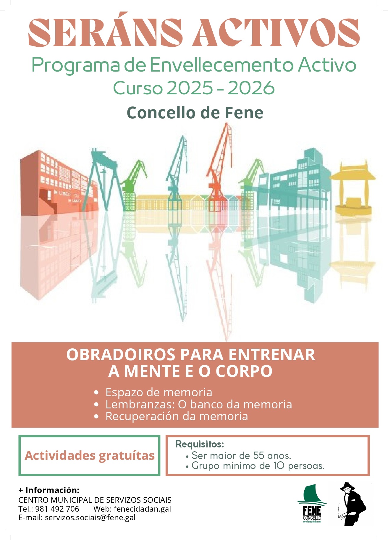 O vindeiro 13 de outubro arrinca una nova edición dos Seráns Activos, programa impulsado pola Concellería de Benestar Social que inclúe os obradoiros de Espazo da memoria e Lembranzas: o banco da memoria. Dúas actividades que se desenvolven de forma itinerante polas diferentes parroquias do termo municipal, en locais sociais e veciñais, namentres que o obradoiro de Recuperación da memoria realízase no centro Sociocomunitario de Fene.