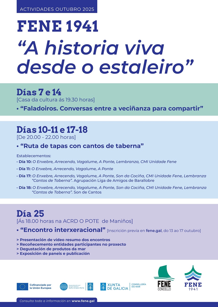 O proxecto “Fene 1941. A historia viva desde o estaleiro” arrinca esta fin de semana coa primeira cita gastronómica da ruta “O estaleiro nas tabernas”, unha proposta que combina tradición mariñeira, gastronomía e música popular, e que forma parte do programa promovido polo Concello de Fene.