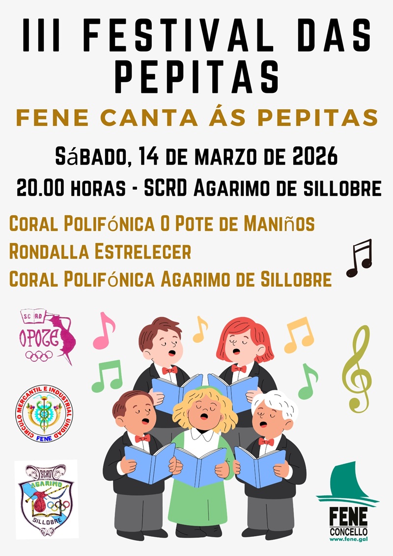 A terceira edición do festival Fene canta ás Pepitas, organizado pola SCRD Agarimo coa colaboración da Concellería de Cultura de Fene, celebrarase o vindeiro sábado, 14 de marzo, ás 20 horas no local social de Sillobre. O certame contará coa participación da coral Polifónica O Pote de Maniños, da rondalla Estrelecer e da coral polifónica Agarimo de Sillobre.