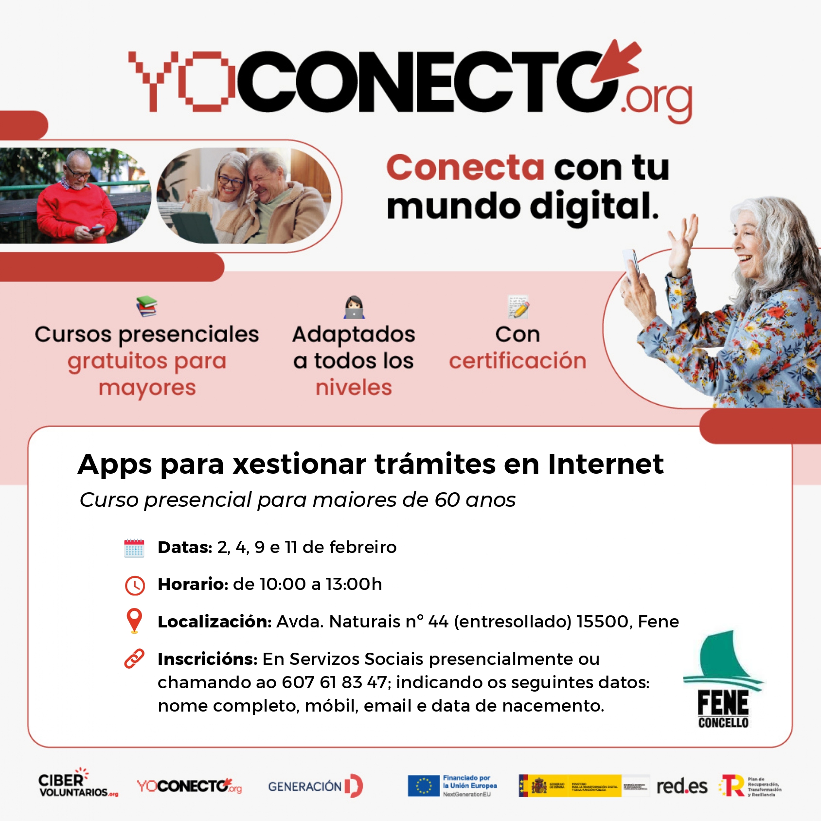 O concello de Fene en colaboración coa fundación Cibervoluntarios organiza dous cursos de formación en competencias dixitais para maiores de 60 anos, entre as datas comprendidas do 2 ao 12 de febreiro de 2026 .