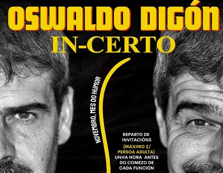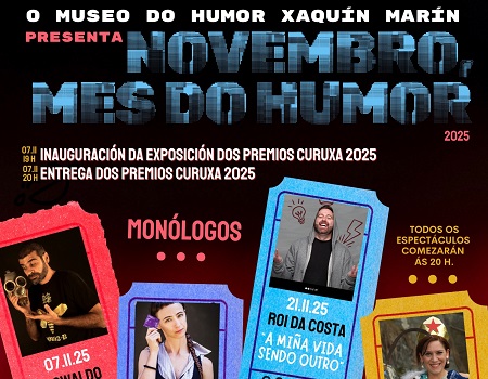 Este venres, 7 de novembro, arrinca o ciclo de monólogos que organiza o Museo do Humor Xaquín Marín de Fene para conmemorar o seu aniversario. Nesta primeira xornada, na que ademais se entregarán os Premios Curuxa 2025, o protagonista será Oswaldo Digón. O espectáculo, titulado “In-certo”, comezará ás 20.00 horas. E a entrada será de balde, previa recollida de invitacións (até un máximo de dúas por persoa adulta) na conserxería da Casa da Cultura de Fene o mesmo día a partir das 19 horas. Aforo limitado.