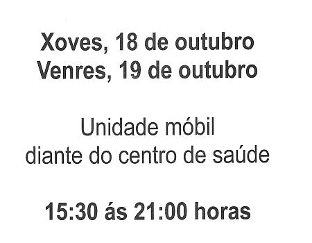 De 15.30 h ás 21.00 h unidade móbil diante do centro de saúde