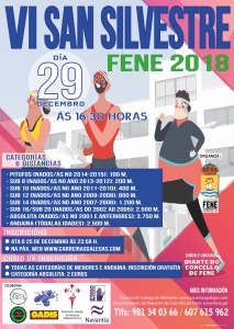 O Concello de Fene organiza a Carreira popular “VI SAN SILVESTRE – CONCELLO DE FENE”. A proba terá lugar o día 29 de decembro de 2018 a partir das 16:30 horas. A saída e meta estarán situadas diante do Concello de Fene (Avenida do Concello s/n).