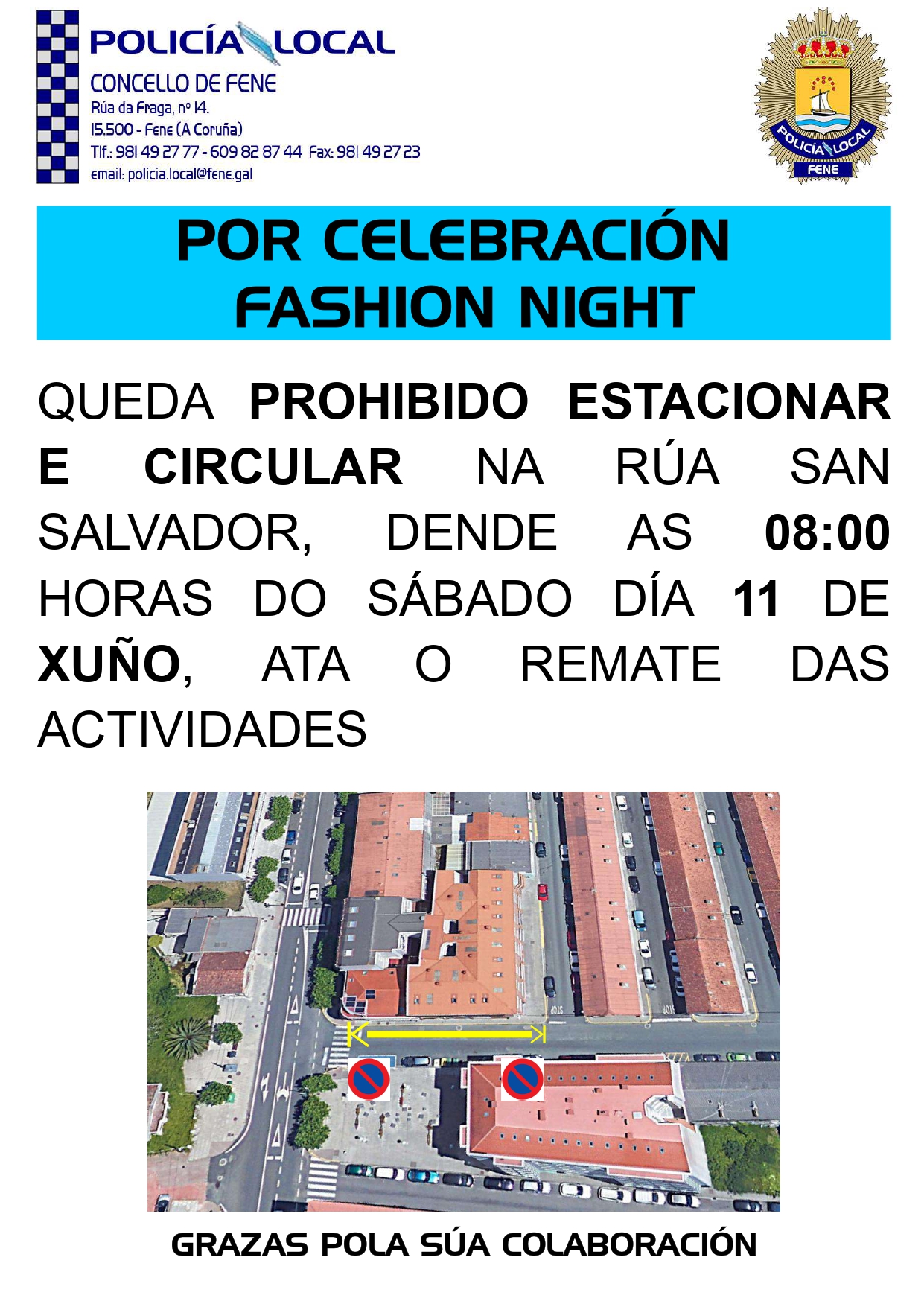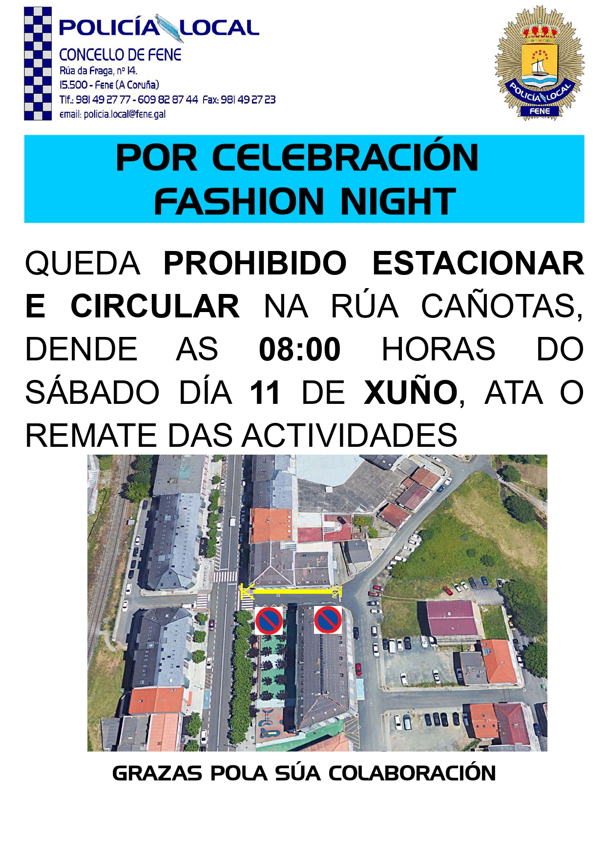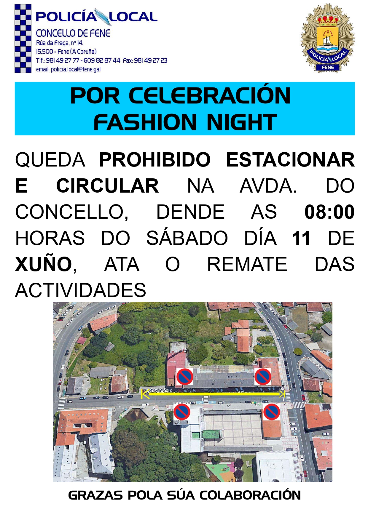 A Policia Municipal do Concello de Fene informa do dispositivo de estacionamento e circulación establecido por mor da Fashion Night deste sábado 11 de xuño.