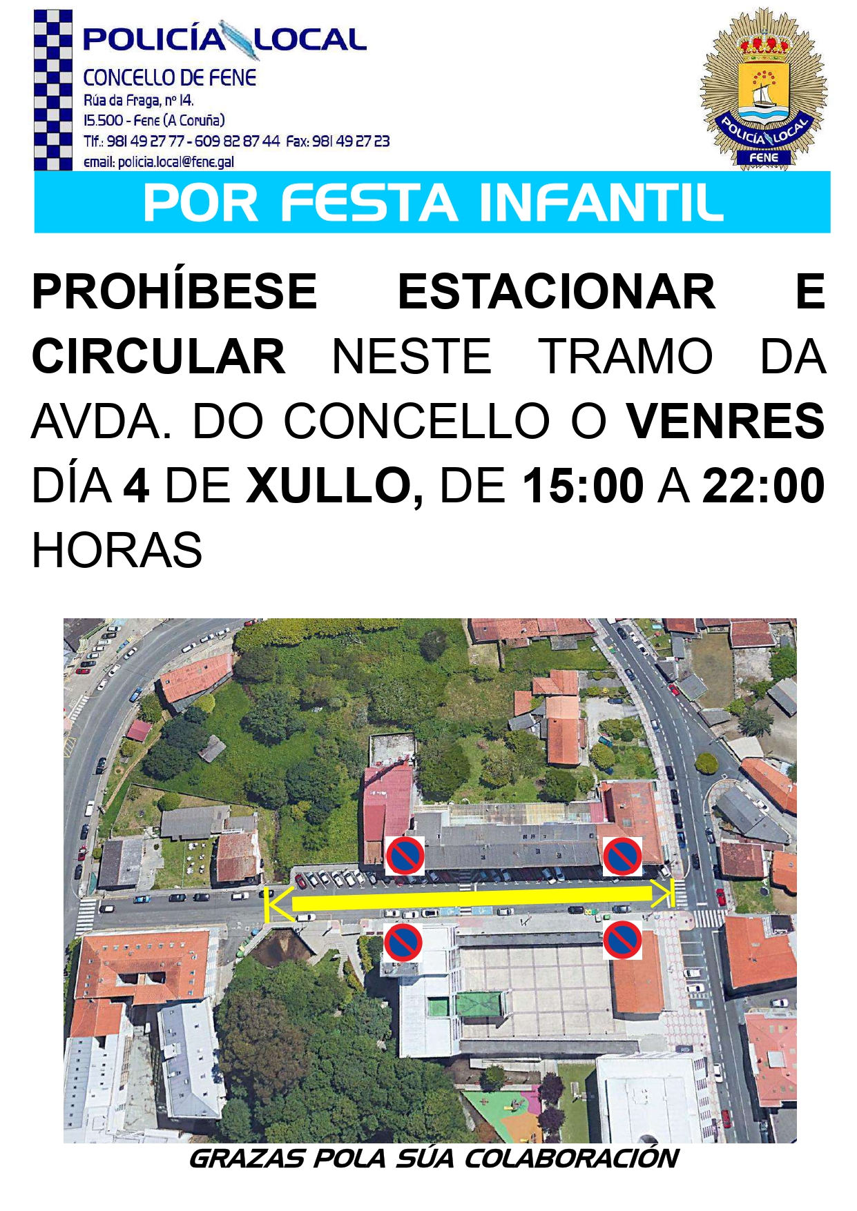 Aviso da Policia Local de Fene en relación coa prohibición de circular e estacionar no treito sinalado da Avda. do Concello o venres 4 de xullo de 2025, de 15 a 22 horas, por mor da celebración da Festa Infantil (ciclo Xullo, mes da Patria).