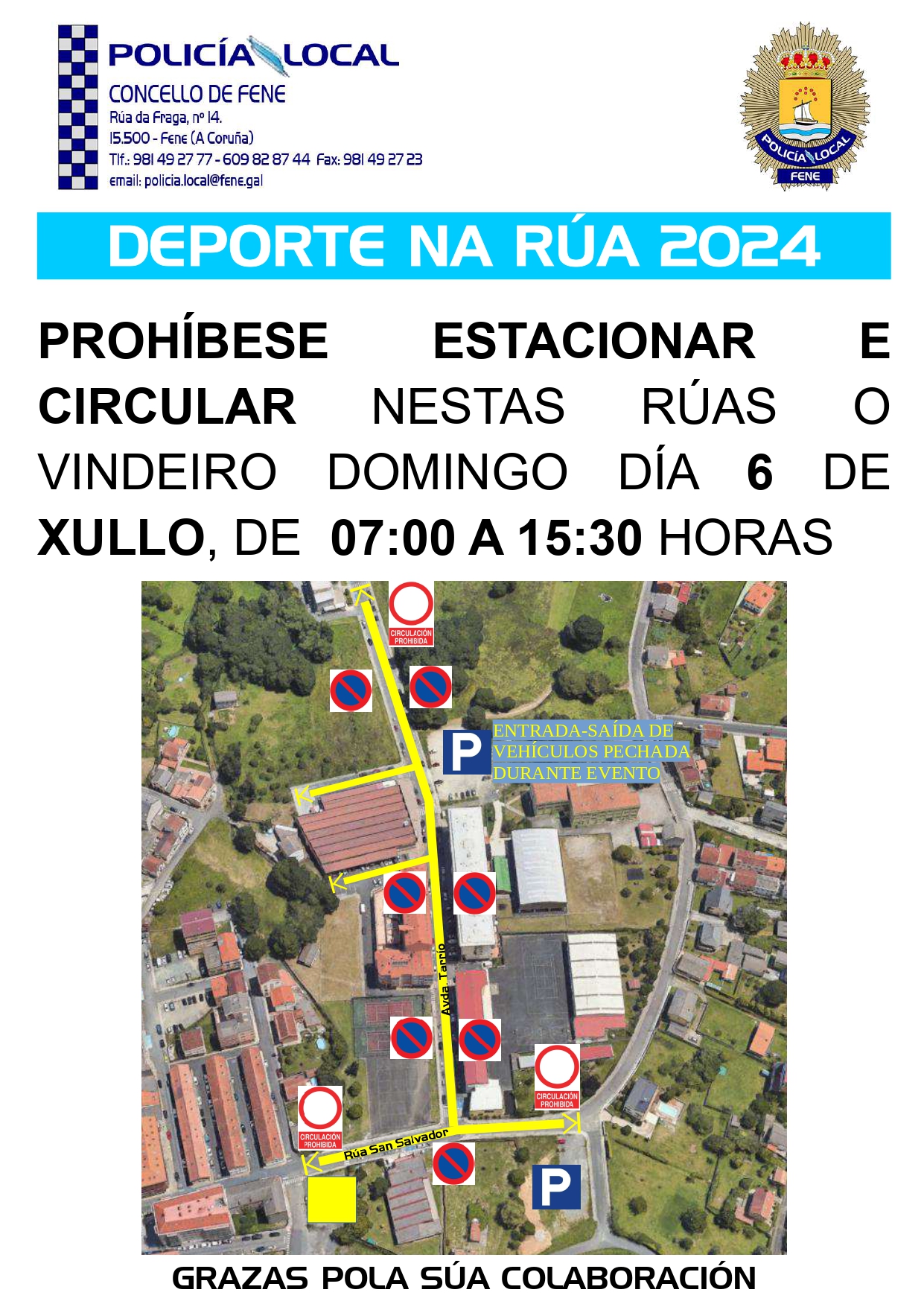 Aviso da Policia Local de Fene en relación coa prohibición de circular e estacionar nos treitos sinalados da Avda. do Tarrío e rúa San Salvador o domingo 6 de xullo de 2025, de 7:00 a 15:30 horas, por mor da celebración do Día do Deporte na rúa.