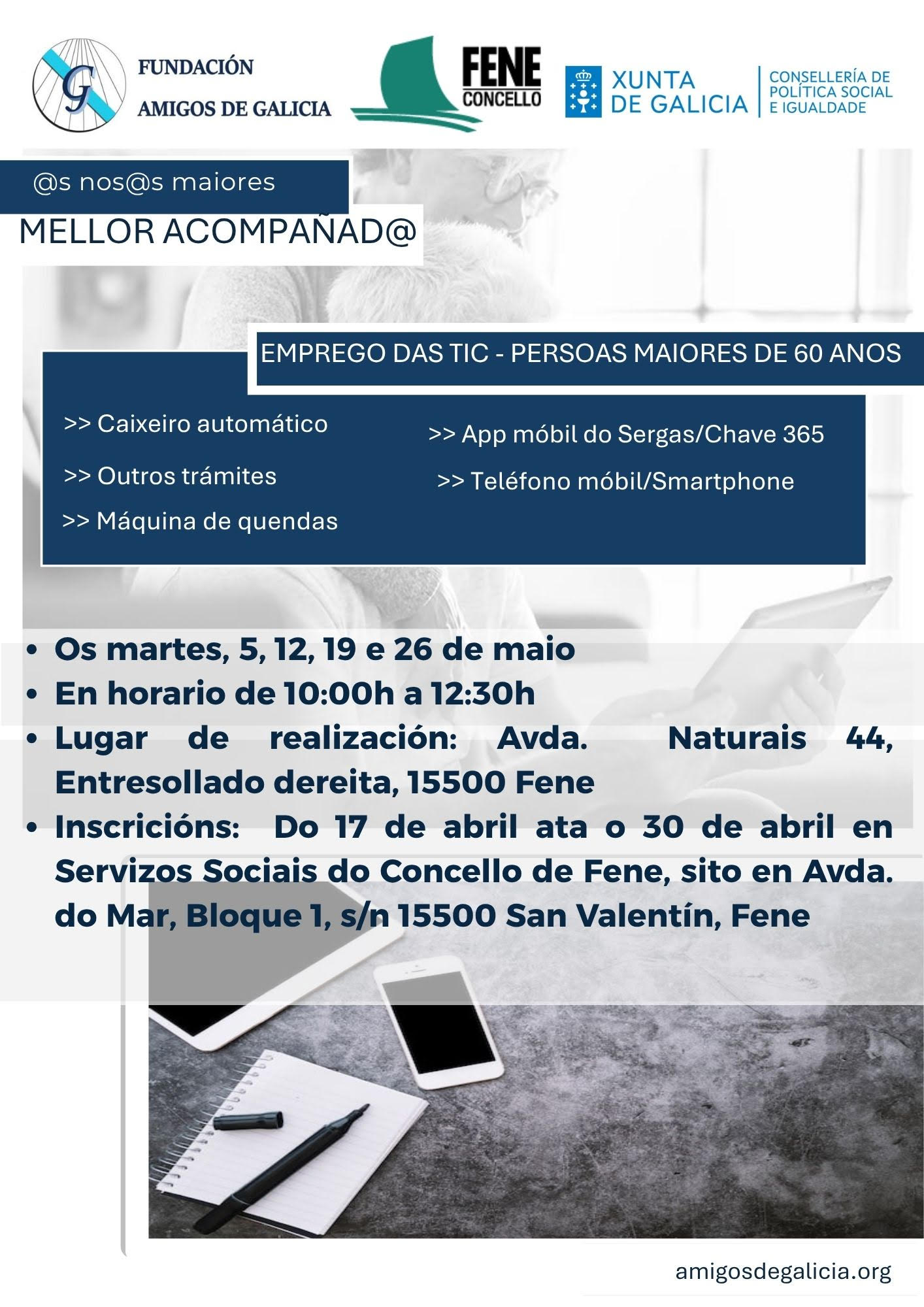 O concello de Fene en colaboración coa Fundación Amigos de Galicia organiza un curso de formación en competencias dixitais para maiores de 60 anos, entre as datas comprendidas do 5 e o 26 de maio de 2026 .