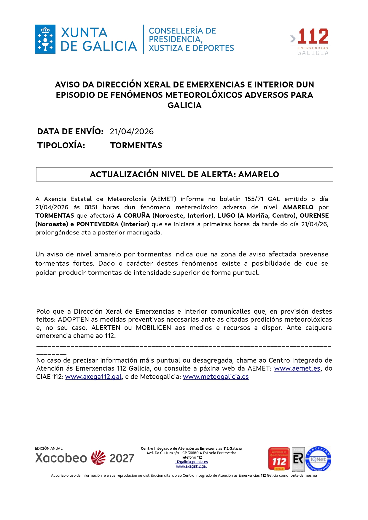 Aviso amarelo por tormentas