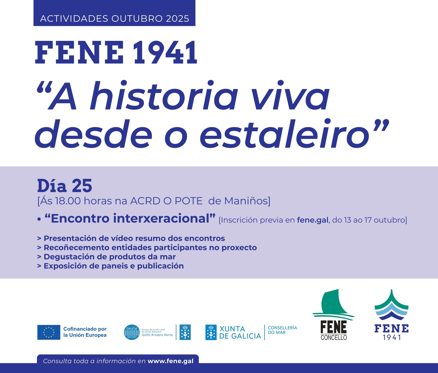 O Concello de Fene vén de abrir o prazo de inscrición para participar no encontro interxeracional do proxecto “Fene 1941. A historia viva desde o estaleiro”, que se celebrará o sábado 25 de outubro ás 18:00 h na ACRD O Pote de Maniños.